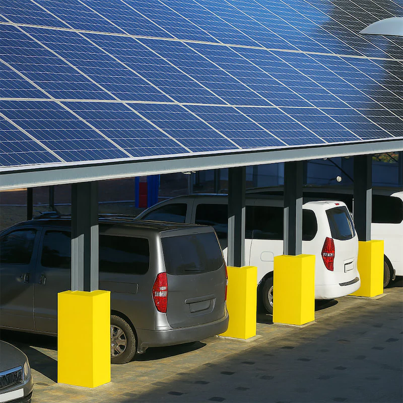 Spécial photovoltaïque : protège les pieds d’ombrières de parking exposés aux manœuvres.