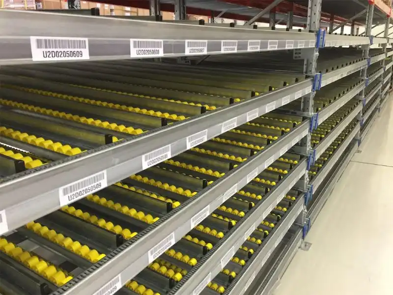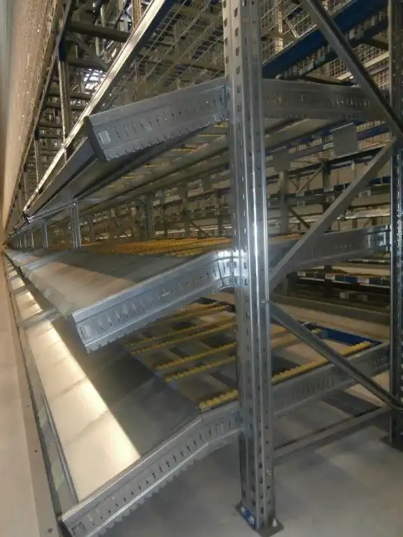 Les palettes (ou charges) sont déposées sur des rails ou rouleaux légèrement inclinés et avancent vers le point de prélèvement, ce qui limite les déplacements et accélère les opérations.